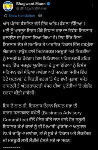ਚੰਡੀਗੜ੍ਹ- ਪੰਜਾਬ ਦੇ ਮੁੱਖ ਮੰਤਰੀ ਭਗਵੰਤ ਮਾਨ ਨੇ ਅੱਜ ਦੇਰ ਸ਼ਾਮ ਮੰਤਰੀ ਮੰਡਲ ਨਾਲ ਮੀਟਿੰਗ ਕੀਤੀ ਹੈ, ਜਿਸ ਵਿੱਚ ਪੰਜਾਬ ਵਿਧਾਨ ਸਭਾ ਦਾ ਵਿਸ਼ੇਸ਼ ਸੈਸ਼ਨ 1 ਮਈ ਨੂੰ ਮਜ਼ਦੂਰ ਦਿਵਸ ਵਾਲੇ ਦਿਨ ‘ਤੇ ਬੁਲਾਉਣ ਦਾ ਐਲਾਨ ਕੀਤਾ ਹੈ।
